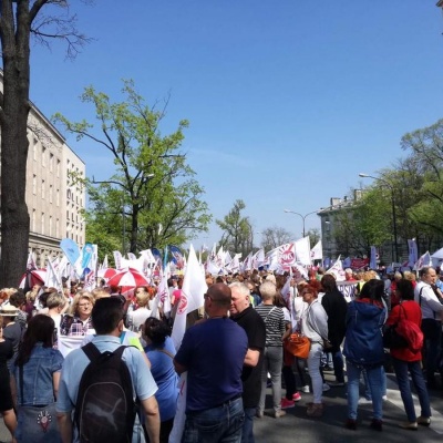 Ponad 5 tysięcy manifestantów - nauczycieli, rodziców i samorządowców - domagało się pod Ministerstwem Edukacji Narodowej godnych wynagrodzeń oraz dymisji Minister Edukacji Narodowej Anny Zalewskiej, która zdaniem protestujących szkodzi polskiej edukacji.